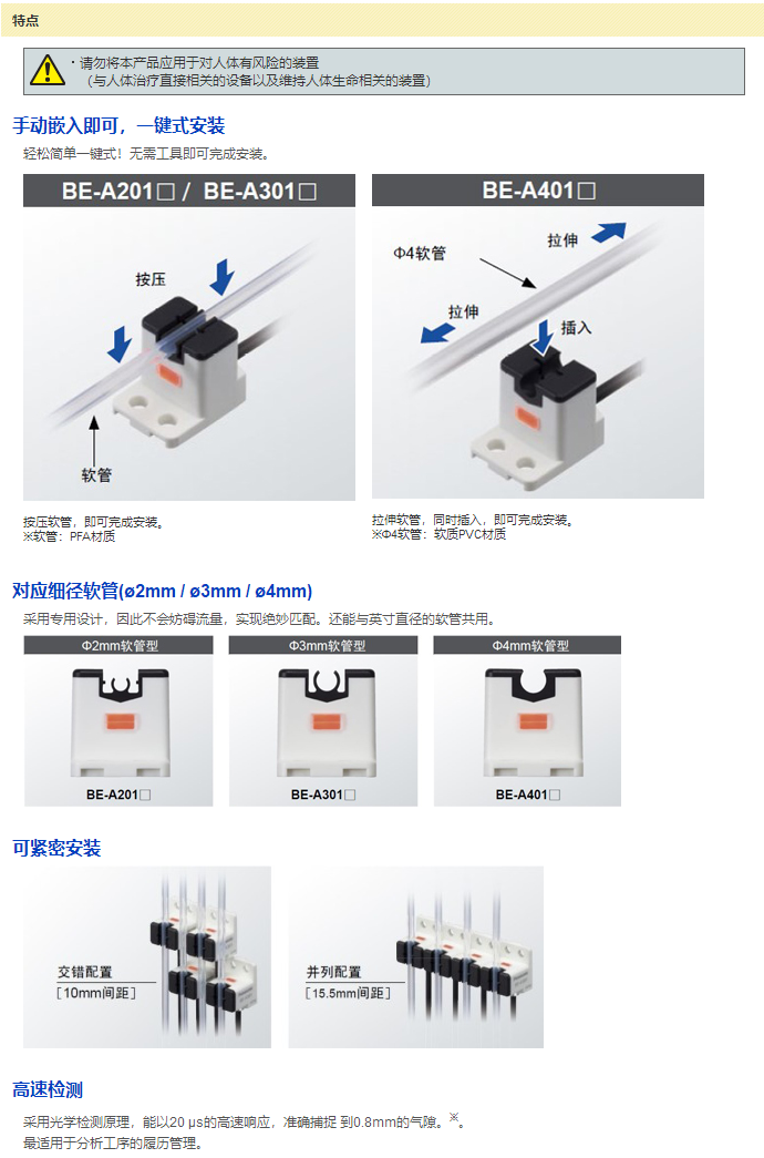 对应细径软管的气泡检测传感器 BE-A